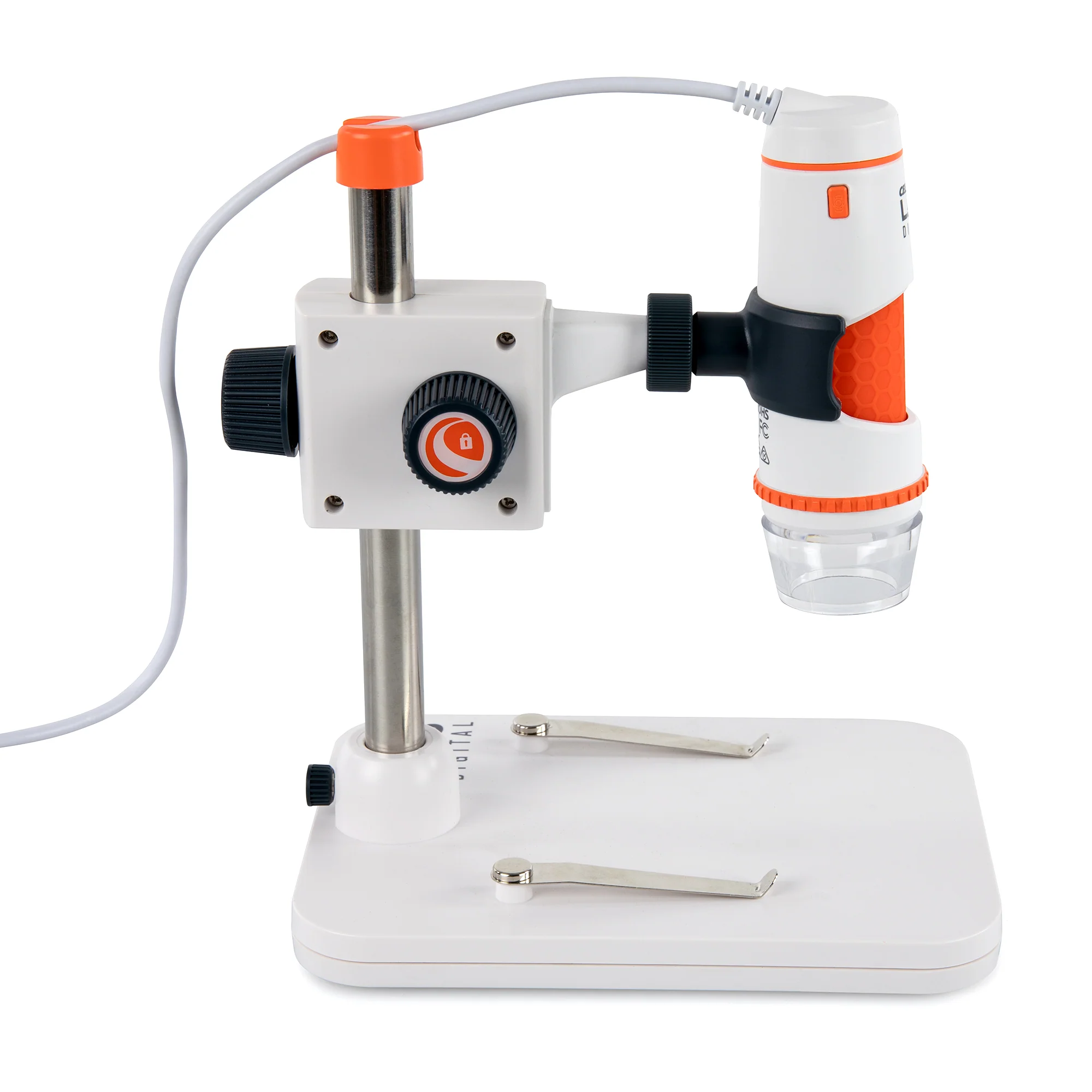 The adjustable microscope stand allows you to precisely position your specimen in seconds. Use the metal post to raise or lower the microscope for coarse focusing and to change magnification. Secure your subject with the built-in specimen clips to keep it steady while you observe or capture images. For larger objects that won’t fit on the stand, rotate the microscope arm up to 180° to examine them right on your work surface. The microscope includes a clip with a ¼”-20 thread that allows you to attach it to any standard photo tripod (sold separately), giving you more flexibility in where and how you observe. Whether you’re using a compact tabletop tripod in a tight workspace, a flexible tripod wrapped around a tree branch in the field, or a low-profile tripod for unique angles, this feature lets you position the microscope exactly where you need it. To access the thread, simply release the locking nut of the microscope clip and remove it from the stand.